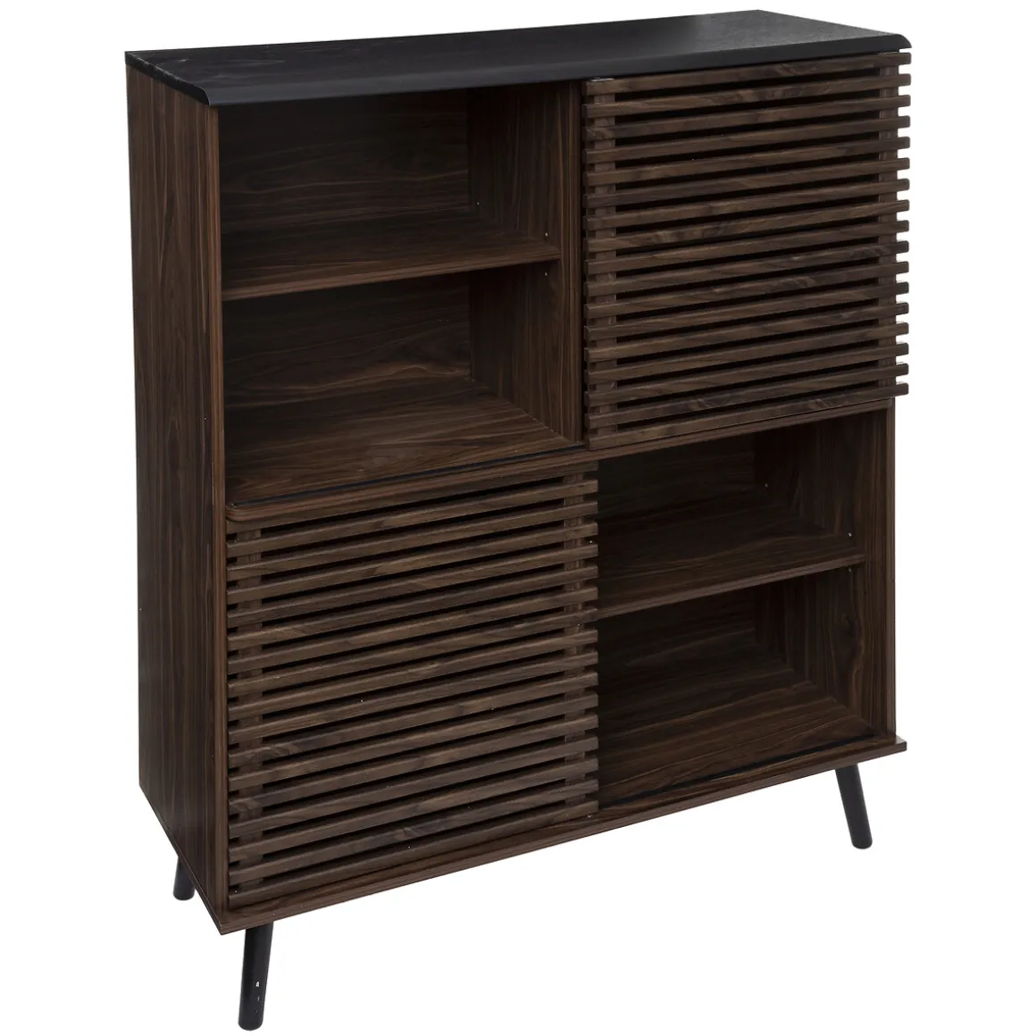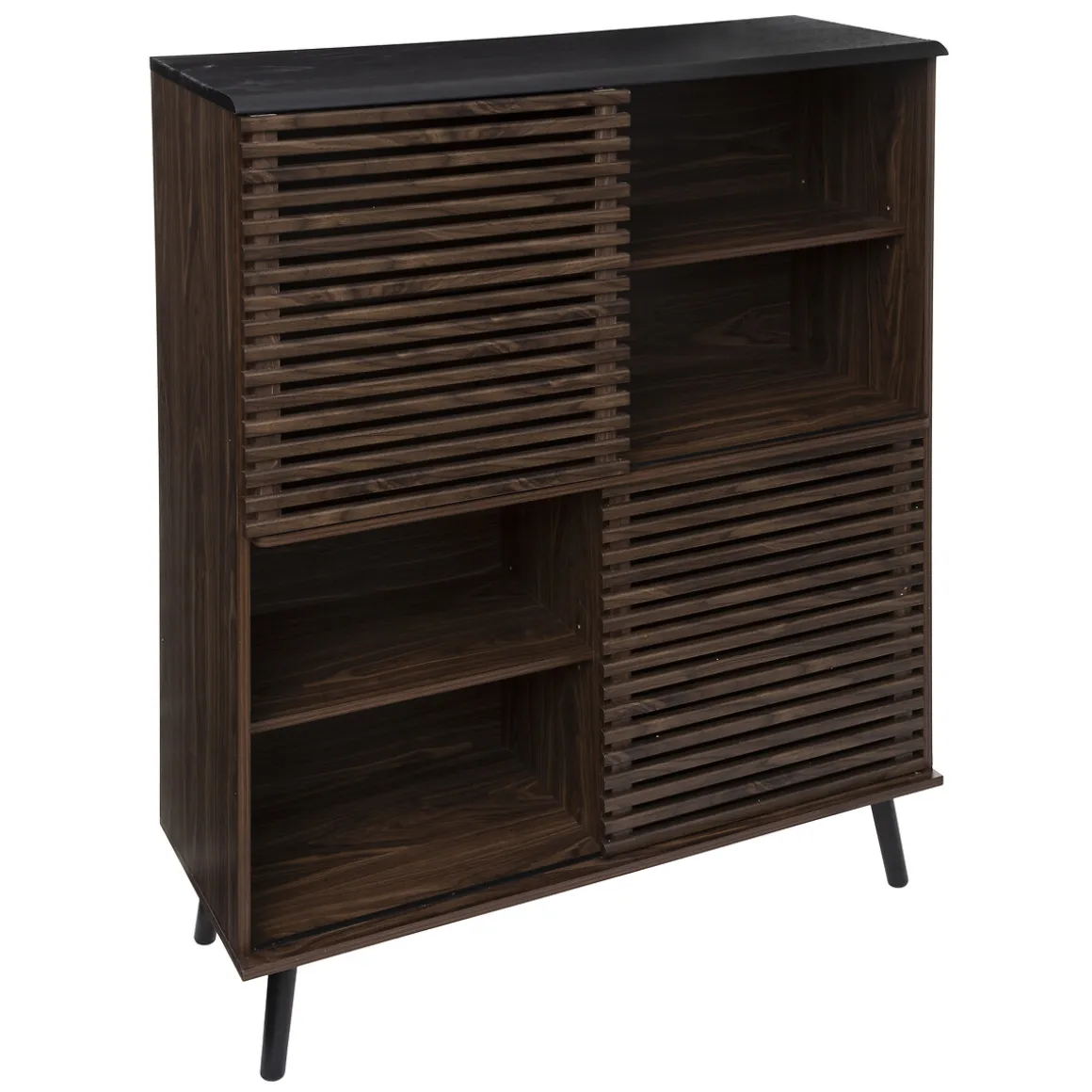Chacune des quatre cases qui composent la bibliothèque « Asmar » dispose de deux niveaux. Vous pouvez ainsi ranger et organiser tout ce que vous souhaitez, qu’il s’agisse de livres ou d’objets déco. Grâce aux portes coulissantes, vous aurez également la possibilité de choisir les cases que vous souhaitez montrer et celles que vous préférez camoufler.
