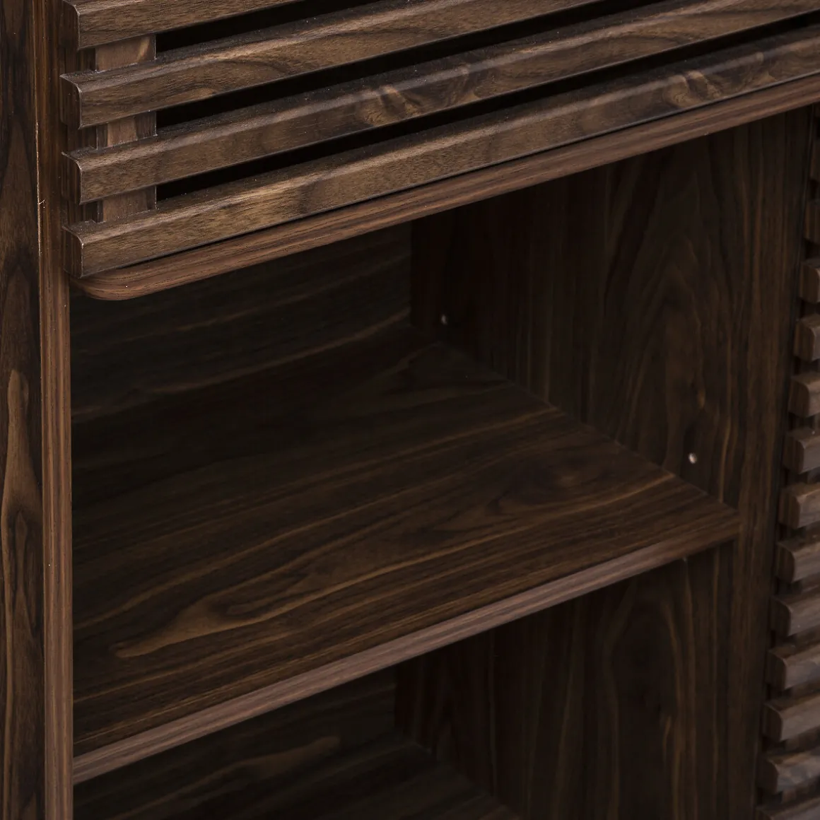 L’utilisation du bois sombre effet noyer confère à cette bibliothèque une allure particulièrement raffinée. Cette opulence maîtrisée est mise en relief par les portes ajourées qui apportent une touche d’originalité.
