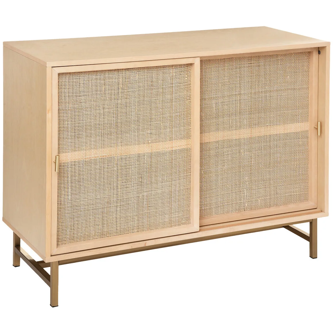 La silhouette brute de ce meuble est adoucie par l’alliance chaleureuse du cannage en rotin et du bois. Les pieds en métal doré apportent quant à eux une touche contemporaine qui confère à l’ensemble un style sophistiqué.