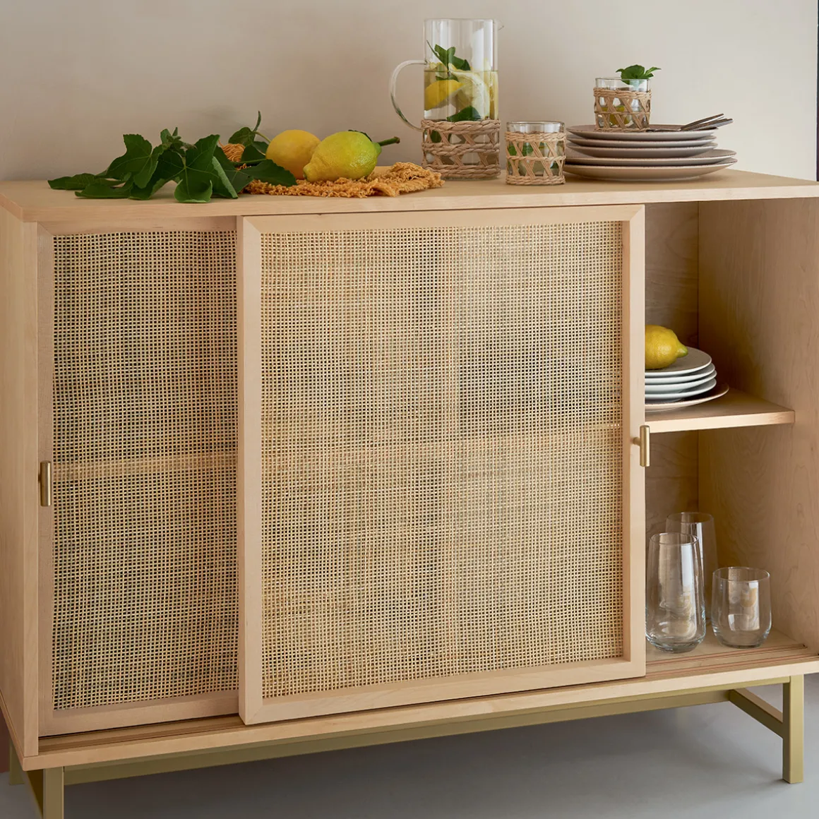 Si vous aimez le rendu du cannage, ajoutez d’autres accessoires du même style: luminaire, miroir ou table basse, vous avez l’embarras du choix.