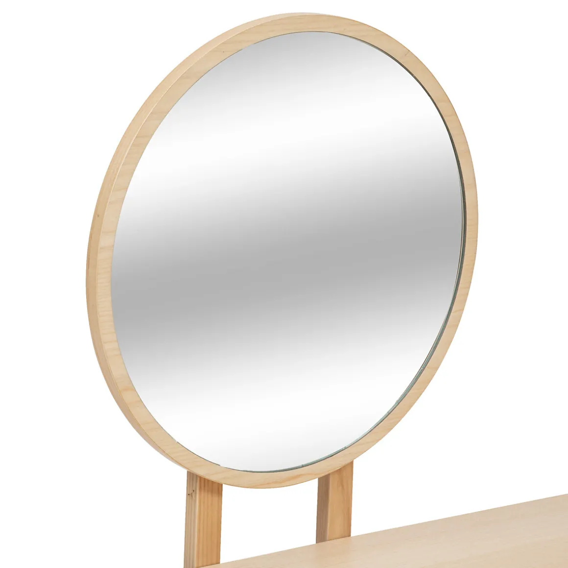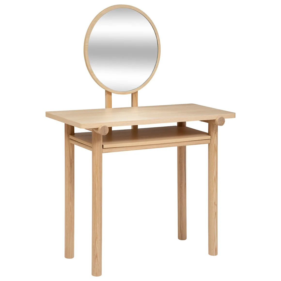 La coiffeuse « Arden » se distingue par son design simple et épuré. Réalisé en frêne, le plateau supérieur surmonte un second niveau de rangement et un miroir encadré de bois est fixé au fond. Des détails habillent l’avant du plan principal.