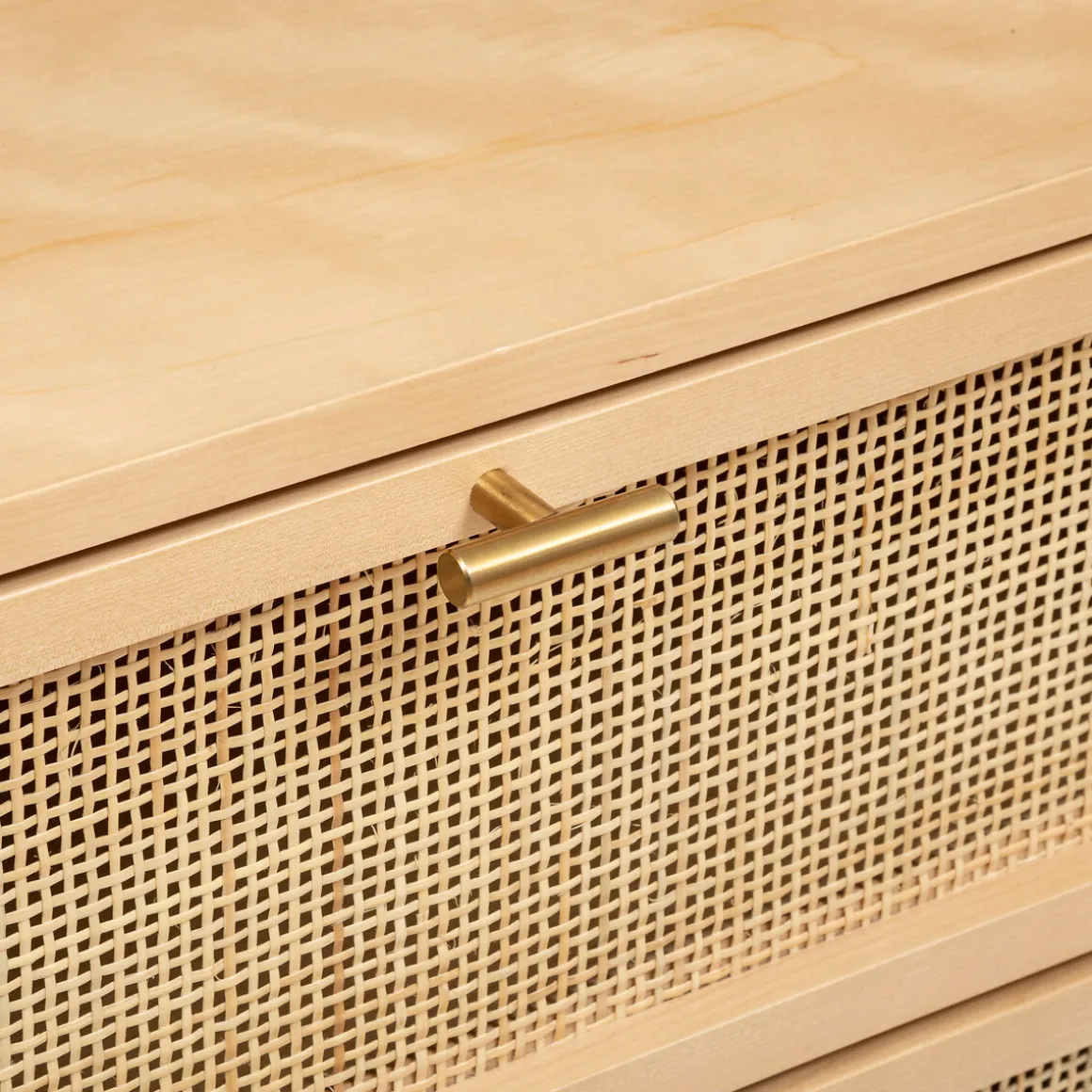 Montée sur un piètement en métal au fini laiton, la commode « Rayo » est réalisée en bois et offre 6 tiroirs de rangement qui accueilleront vos vêtements, dans une chambre comme dans un dressing. Le cannage en rotin sur la façade des tiroirs lui confère un style moderne et sophistiqué.