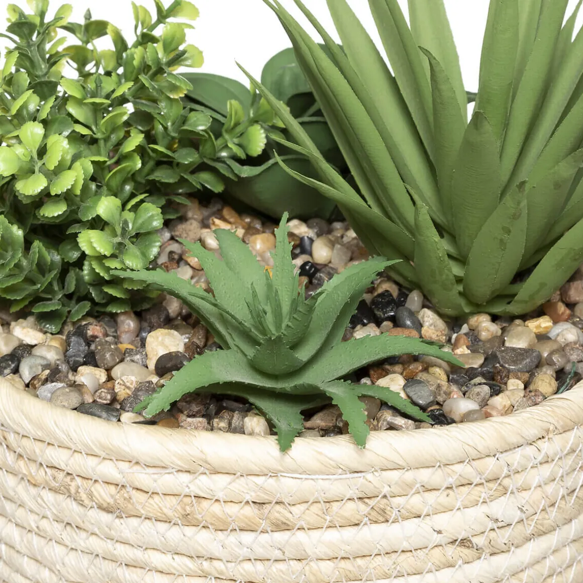 Le pot de cette composition florale artificielle a été fabriqué à partir d’une matière originale : le maïs. Cela confère une véritable authenticité à cette composition florale artificielle car c’est une matière naturelle encore assez peu utilisée dans la confection d’objet. Associé à des plantes artificielles typiques des régions très chaudes, le résultat est vraiment bluffant.