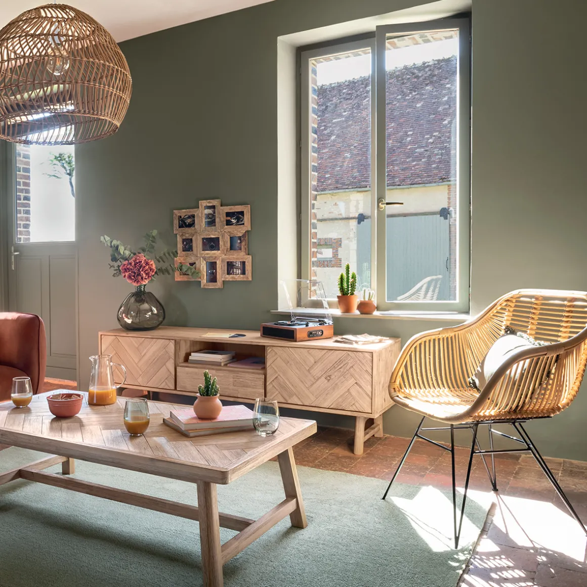 Pour créer un espace harmonieux dans votre pièce, associez votre fauteuil « Koeta » en rotin et métal à une table aux pieds en bois Atmosphera.