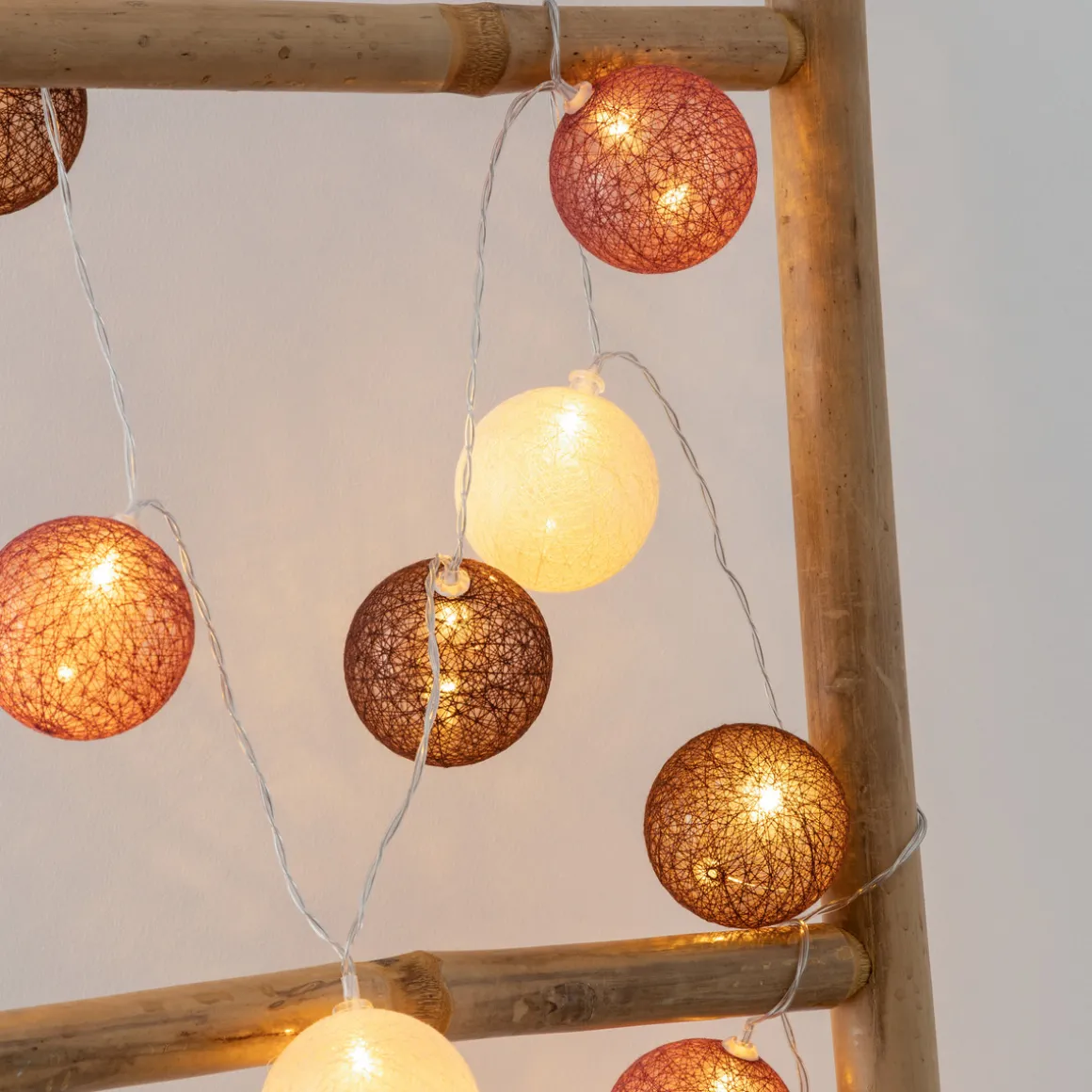 Cette guirlande compte 20 boules reliées entre elles contenant chacune une ampoule LED. Votre guirlande diffusera une lumière plus ou moins teintée mais toujours tamisée. Cet accessoire lumineux se branche sur secteur.