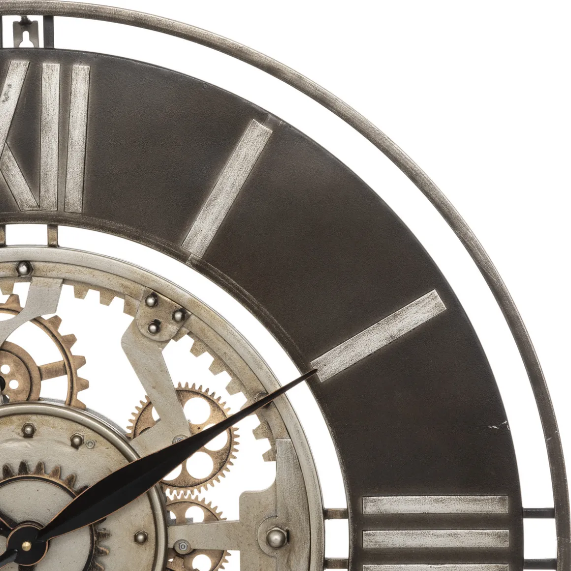 Le diamètre généreux de cette horloge murale vintage en métal éblouira vos invités. Tout en rondeur, elle présente des rouages au centre, des aiguilles authentiques, et des chiffres romains tout autour du cadran. Cet accessoire original s’intègrera parfaitement dans un intérieur au style néo-industriel.