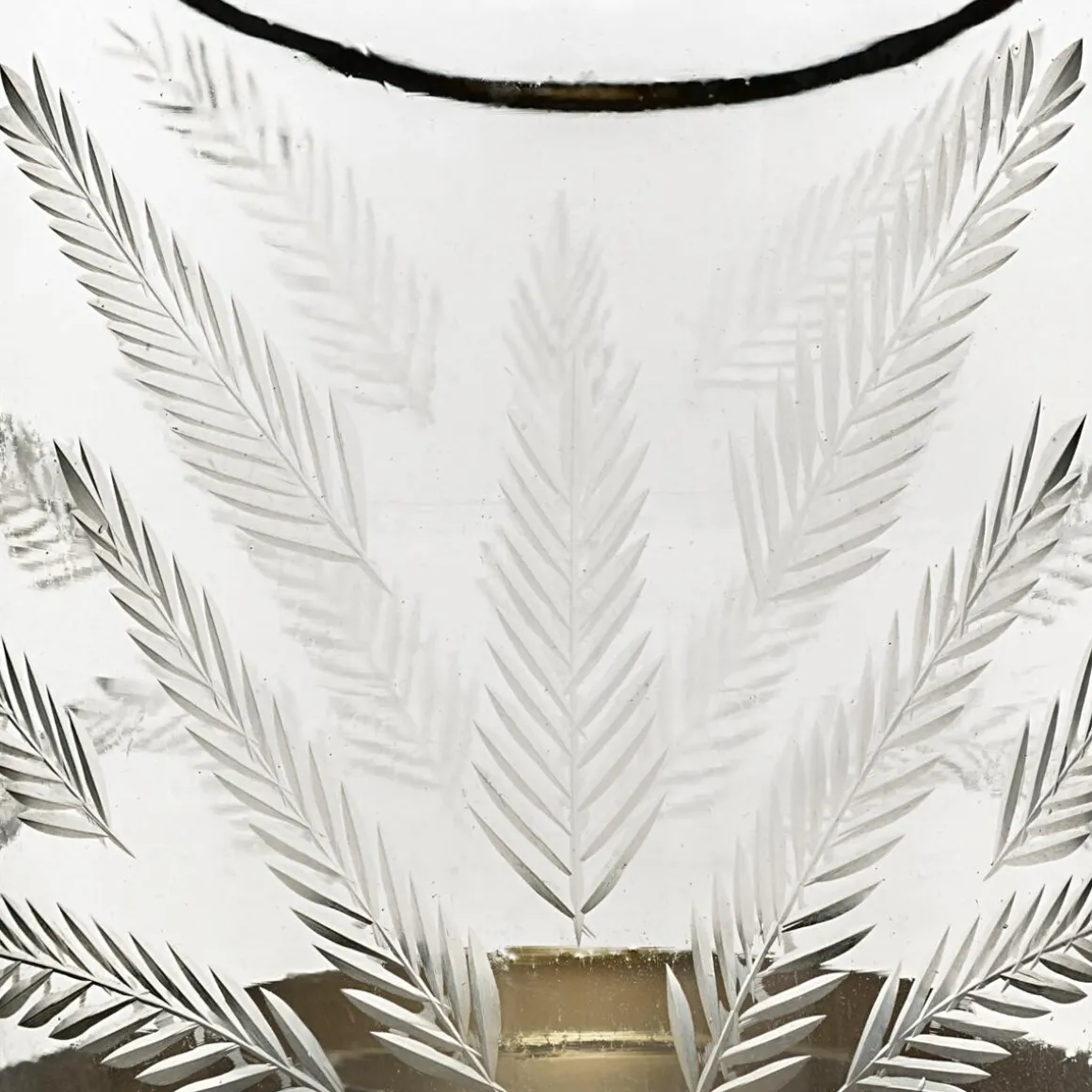 Cette lanterne se compose d’une cloche en verre ciselé décorée de motifs en forme de palmes, d’une anse minimaliste en métal et d’un socle en métal qui intègre un espace dédié à une bougie. La partie en verre possède une ouverture sur le haut.
