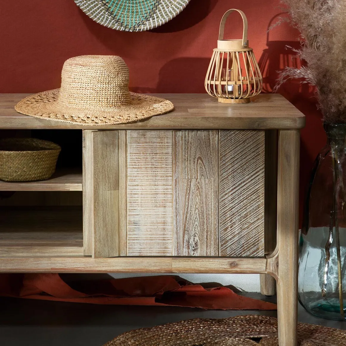 Agrémentez votre meuble TV de quelques objets artisanaux rapportés de vos voyages, tels qu’un pot en terre cuite ou une panière en paille.