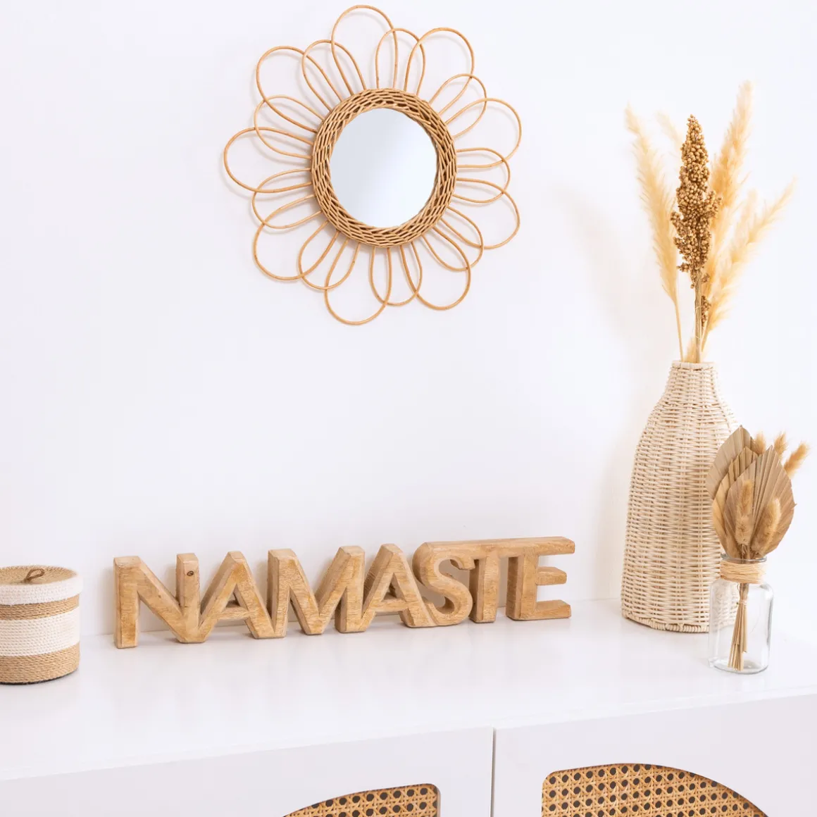 Ce miroir « Cayetana » peut être entouré d’autres miroirs Atmosphera aux tailles variées, en rotin ou en osier.
