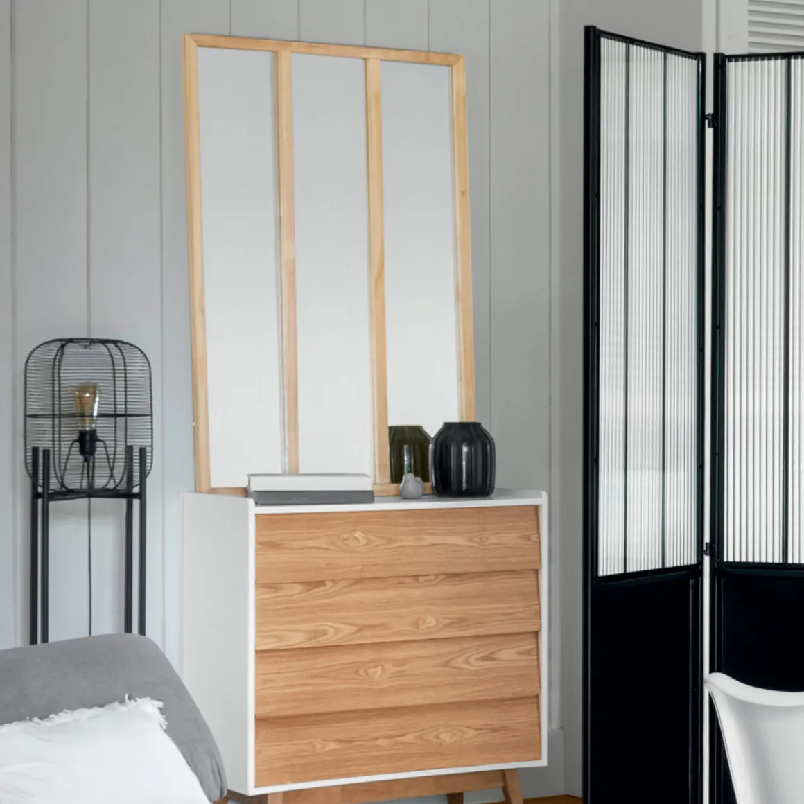 Pour jouer sur les contrastes, n’hésitez pas à associer le miroir avec des pièces en métal Atmosphera comme des lampes filaires.