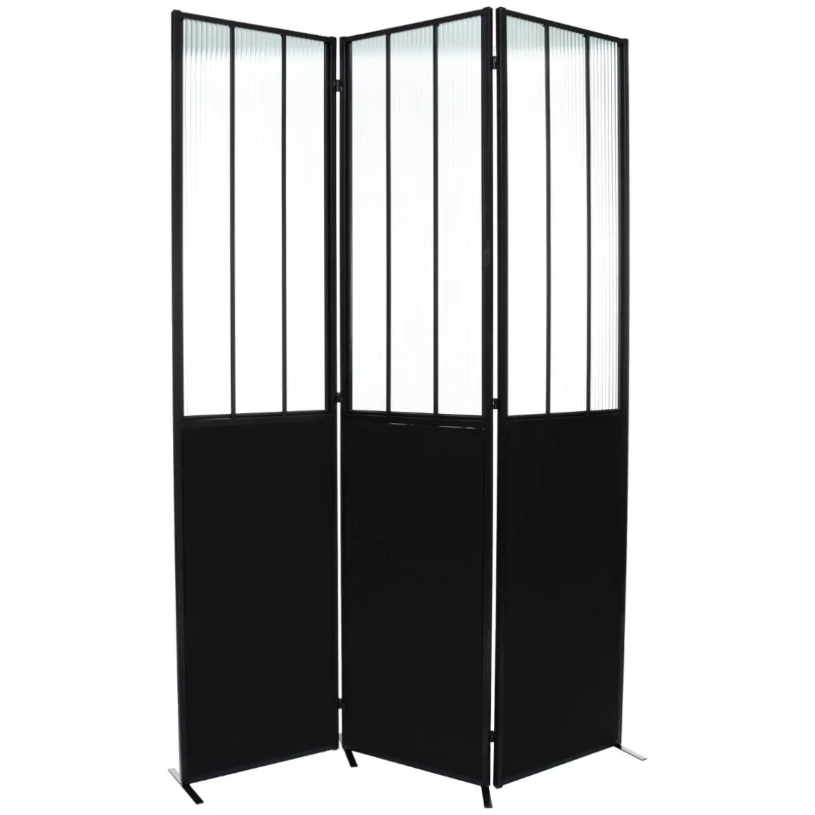 Idéal pour cloisonner l’espace sans faire de travaux, ce paravent en fer et en verre trempé séduit par ses lignes sobres et sa touche factory.