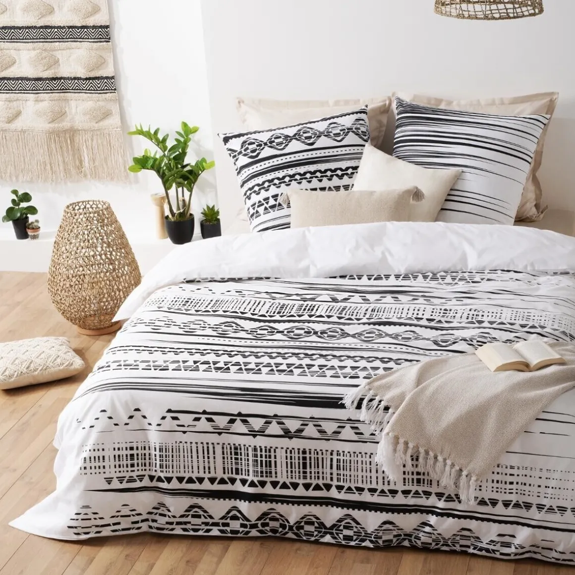 La parure de lit « Etnik » est imprimée de motifs graphiques qui invitent au voyage. En coton, elle comprend une housse de couette deux personnes fermée par des boutons invisibles et 2 taies d’oreiller carrées.