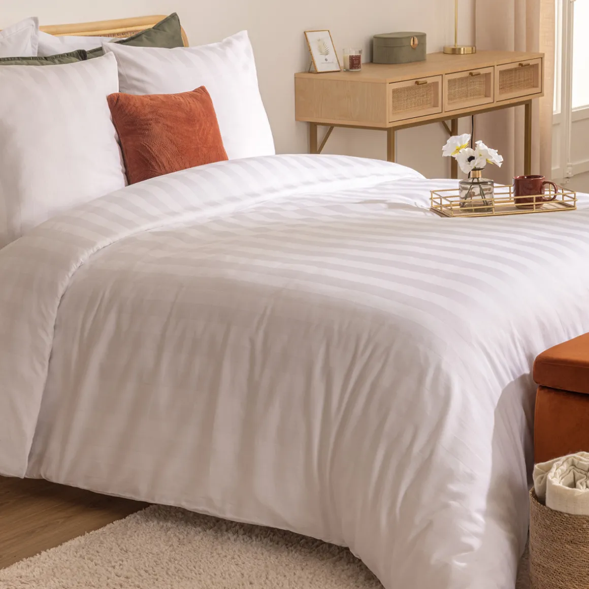 Avec sa couleur neutre, la parure de lit « Isadora » se mariera aisément avec des coussins Atmosphera.