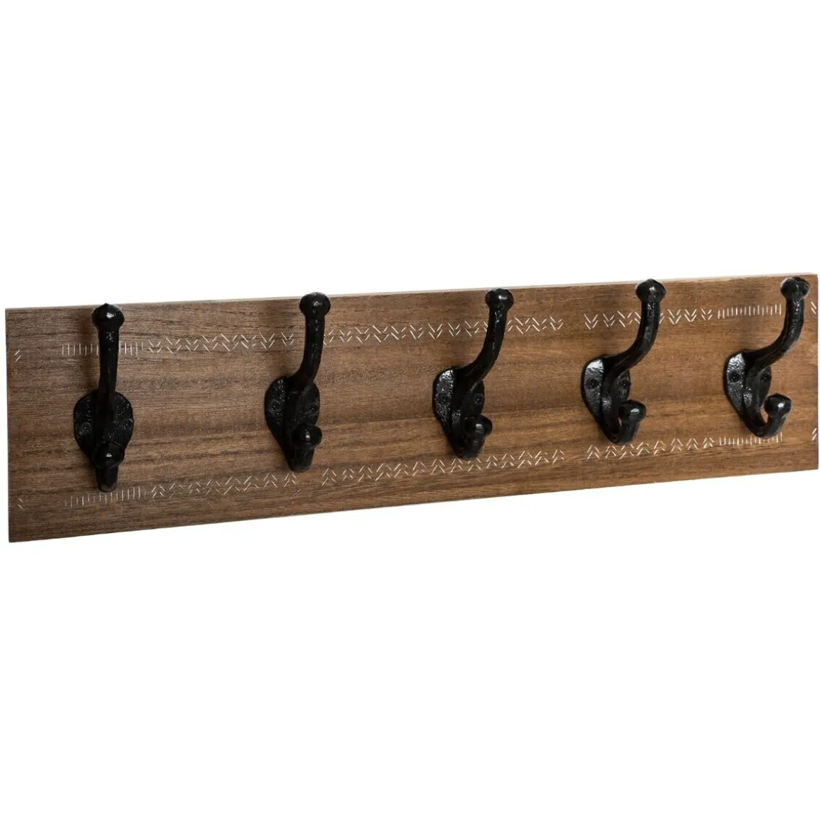 La structure façon bois brut est composée de 5 crochets qui vous permettront de suspendre vos vestes et écharpes. Le détail qui change tout : les motifs discrets gravés en blanc qui apportent une touche d’originalité et contrastent avec le bois foncé et le métal.