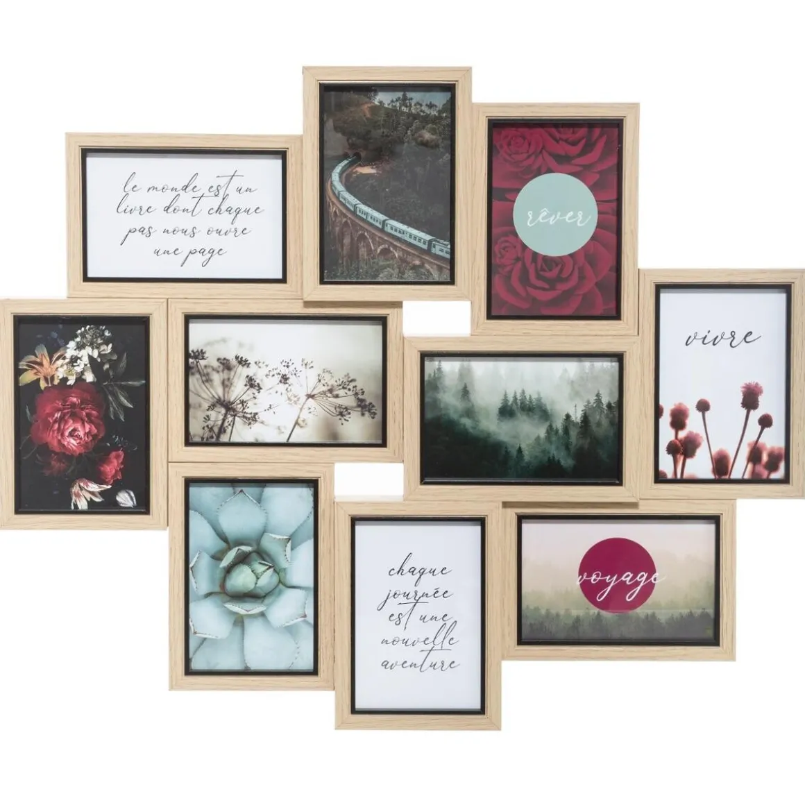 Les dix cadres assemblés au sein de ce pêle-mêle « Kyle » ont été agencés de manière irrégulière. Vous pourrez l’accrocher dans les deux sens, vertical ou horizontal. L’alliance des lignes contemporaines et de la matière façon bois facilitera l’intégration de ce modèle dans un intérieur moderne ou vintage.