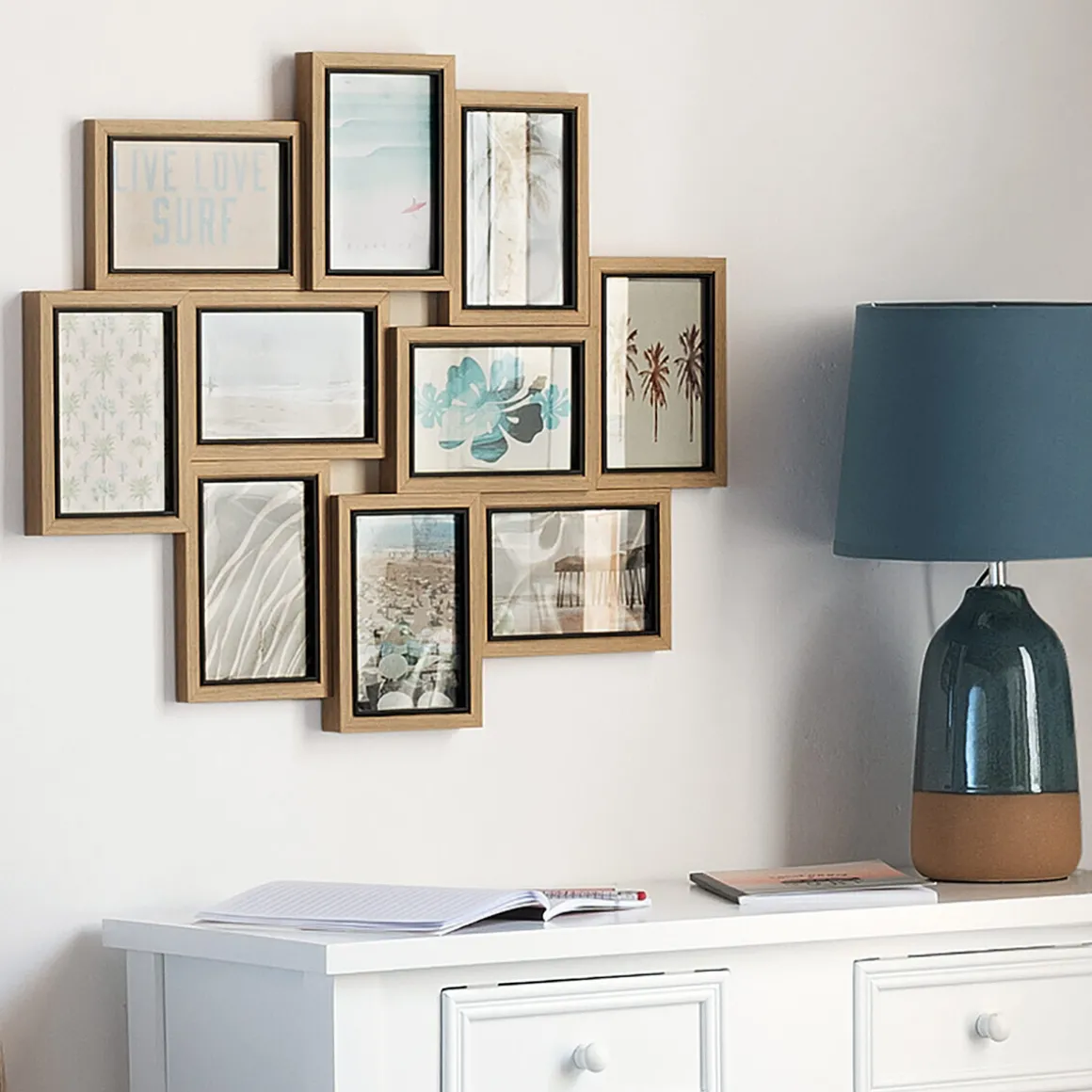 Pour une ambiance nature, accrochez ce pêle-mêle 10 photos « Kyle » au-dessus d’une console ou d’un buffet Atmosphera en bois clair.