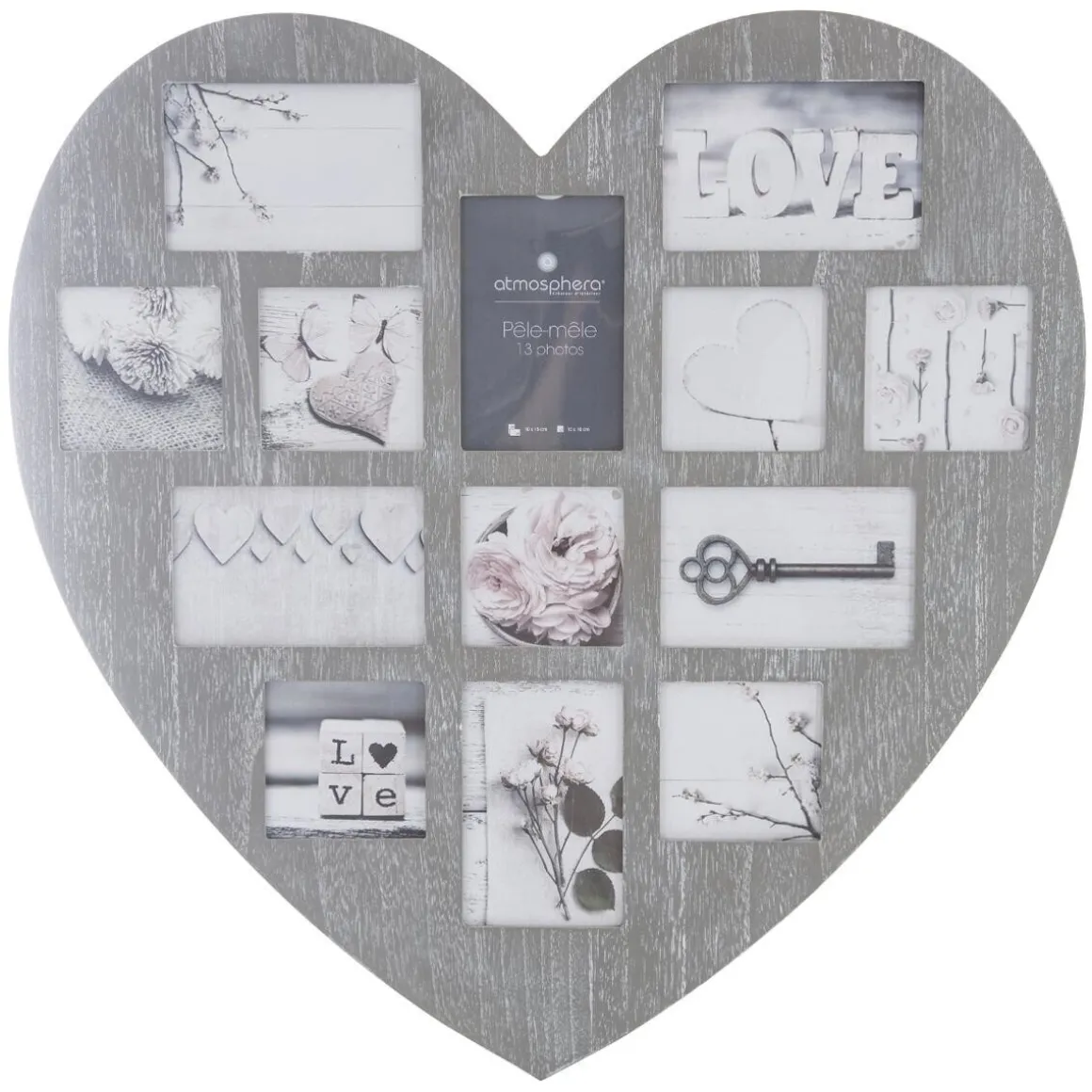 Idéal pour exposer une sélection de vos photos ou cartes préférées, ce pêle-mêle « Patine » en forme de coeur est réalisé en bois à l’aspect cérusé. Disponible dans deux teintes douces, il vous permettra de disposer 13 photos dans des cadres en verre de tailles et formes différentes. Ce pêle-mêle poétique trouvera sa place au-dessus d’une commode ou d’une tête de lit.