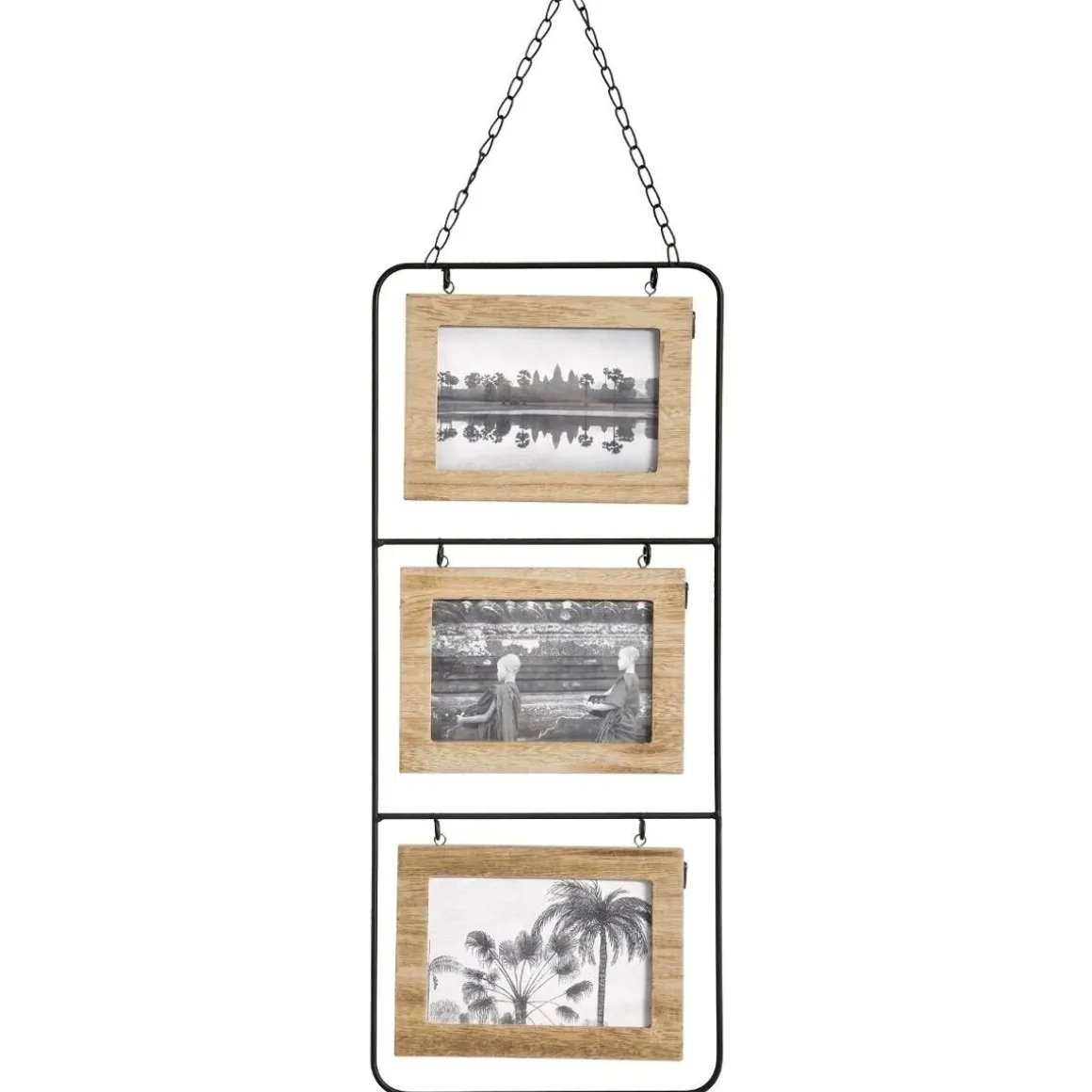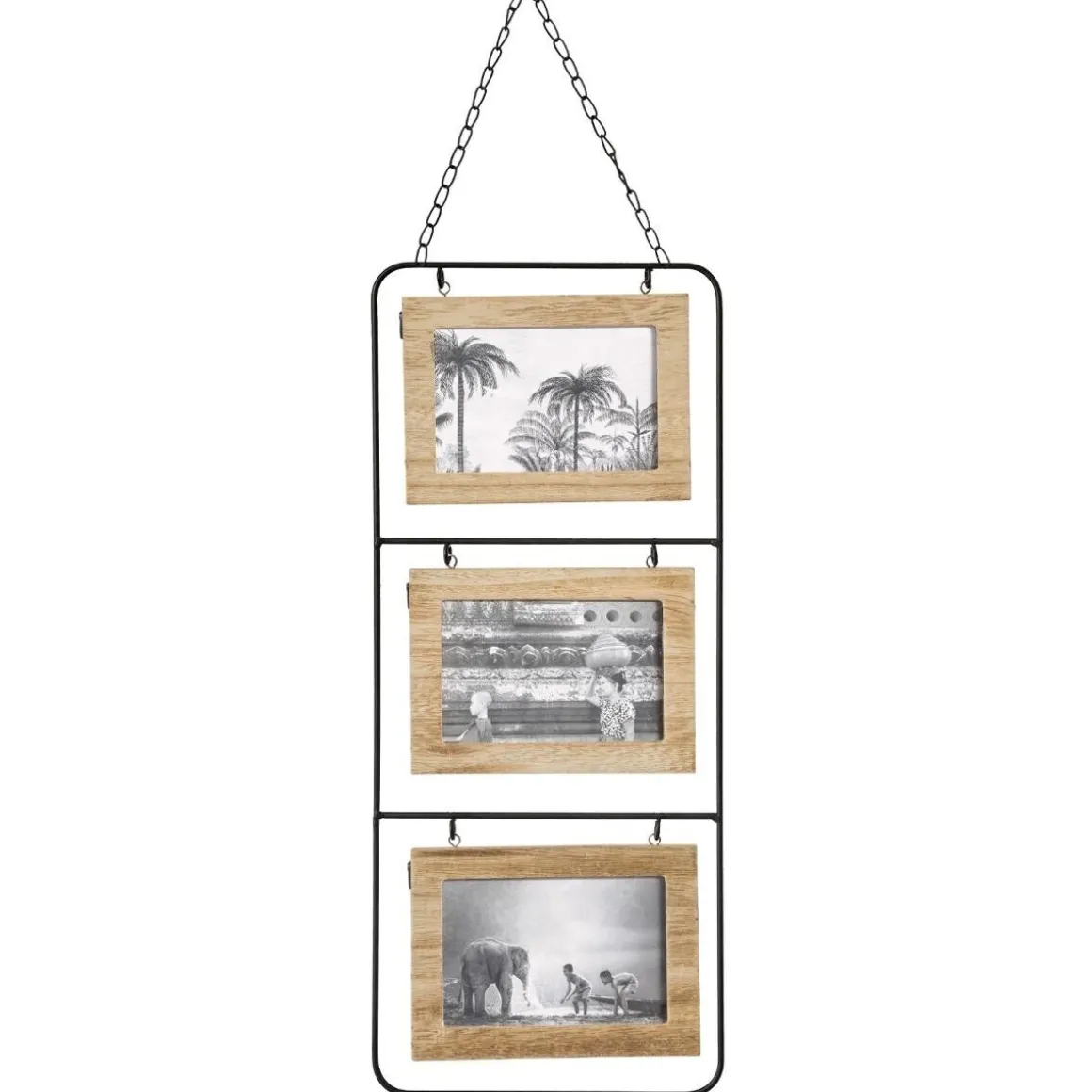Ce pêle-mêle « Vivek » compte trois cadres recto-verso en fibres de bois accrochés à un montant métallique. Le tout est suspendu par une chaîne, qui donne un air vintage à cet accessoire. C’est un élément de déco parfait pour apporter une touche naturelle dans un intérieur industriel.