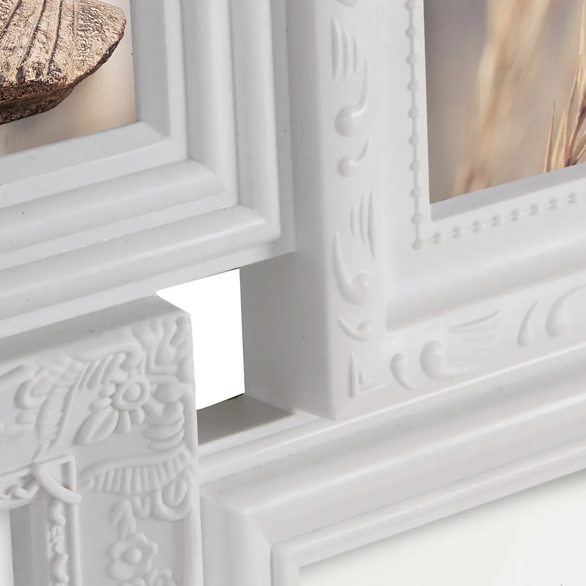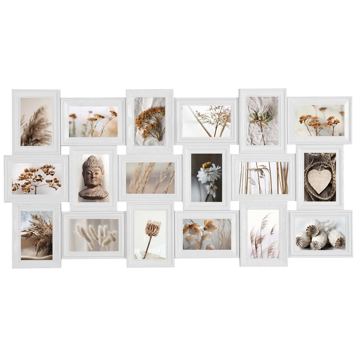 Ce pêle-mêle « suzy » est composé de 18 cadres vitrés qui présentent des moulures imitant le bois et décorées de motifs différents. Très bucolique, il vous permettra de réaliser une grande composition avec vos photos favorites ou avec des cartes fleuries et des citations. Large de 100 cm, ce pêle-mêle habillera volontiers un grand mur et produira un effet chaleureux!