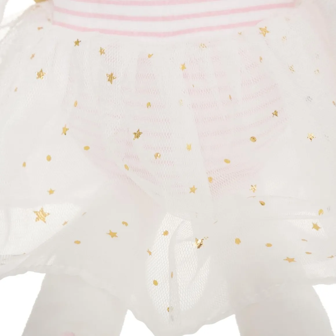 Très décorative, la ballerine porte un tutu rayé à longue jupe de tulle imprimée d’étoiles et des chaussons irisés assortis au noeud fixé sur son oreille. Des ailes brillantes sont accrochées dans son dos. Magique !