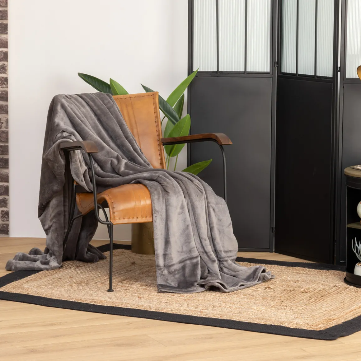 Associez ce plaid uni en flanelle à une table de chevet et un luminaire en bois Atmosphera pour un style authentique.