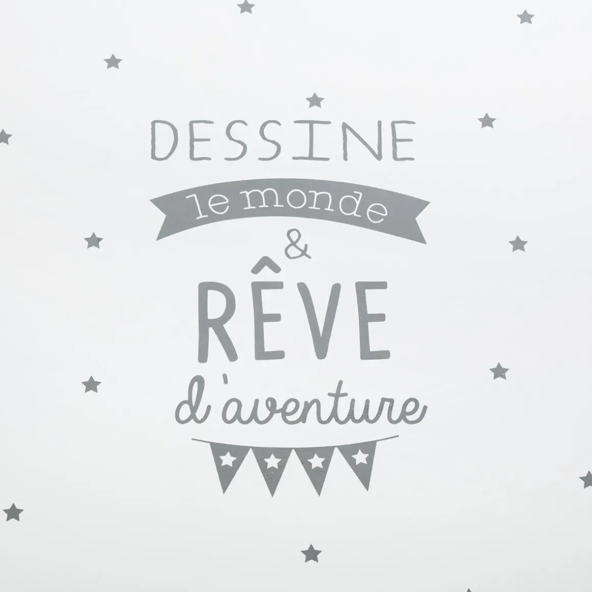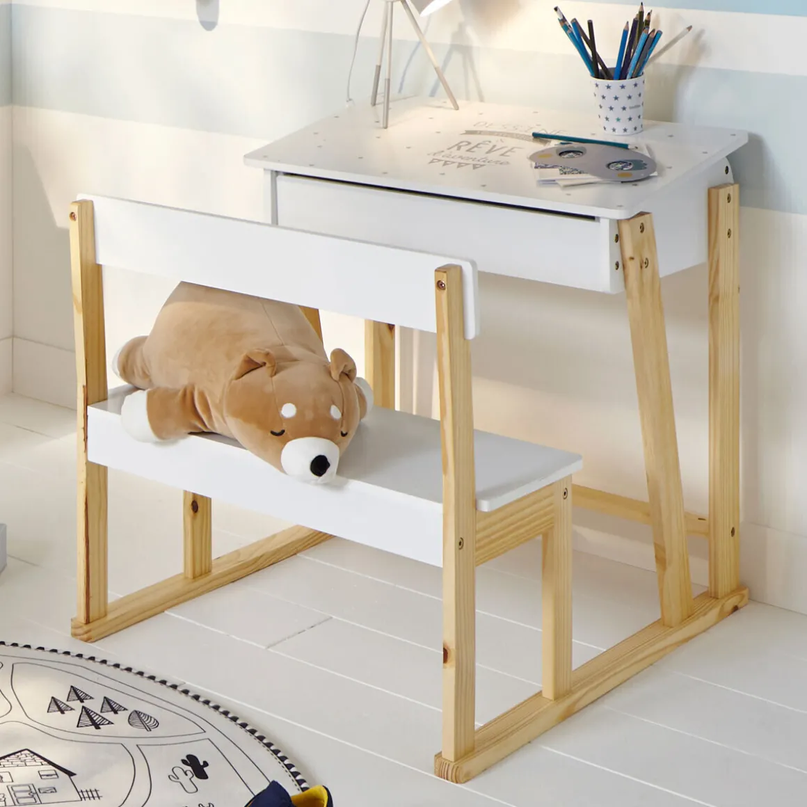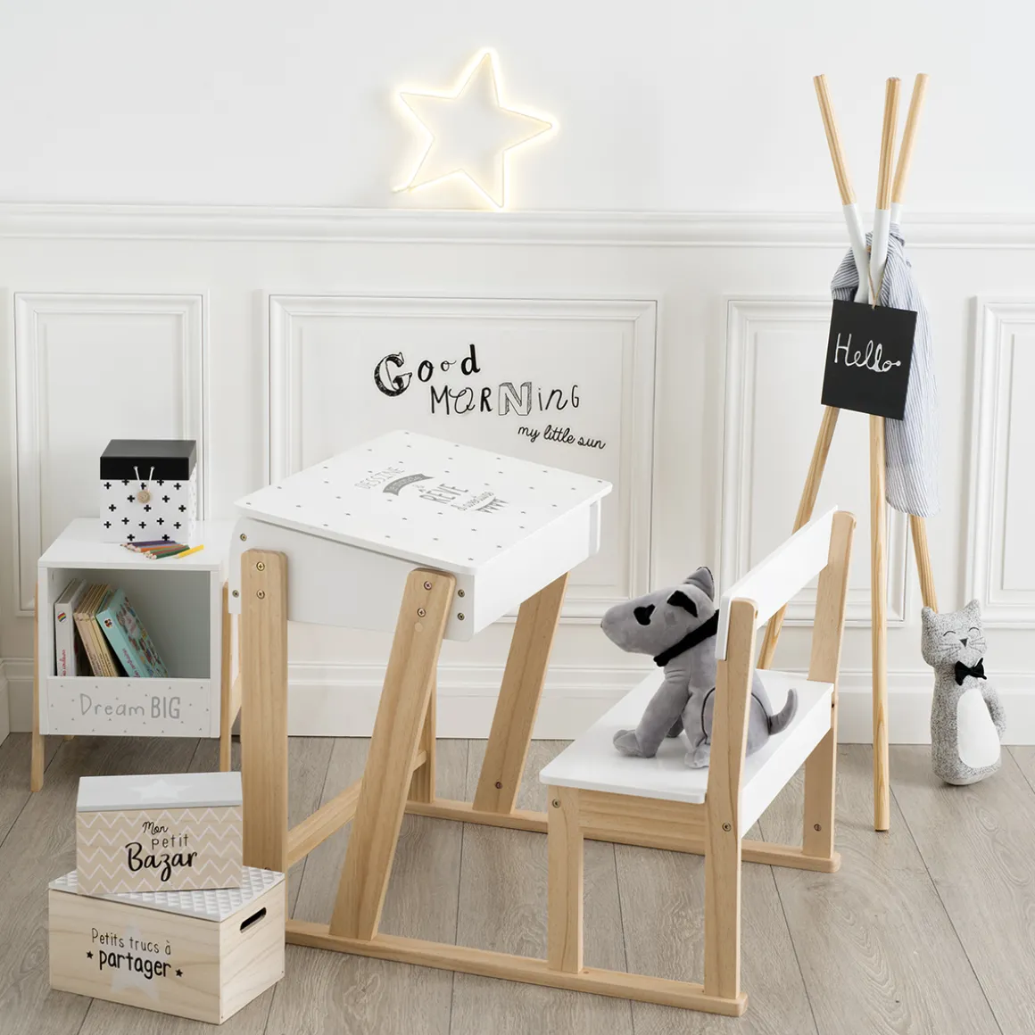 Les pieds en pin massif de ce pupitre contrastent avec le coloris plus clair du bureau et du banc. On aime tout particulièrement cette touche de contraste qui apporte un véritable esprit design. Le panneau supérieur arbore un imprimé graphique et un message.