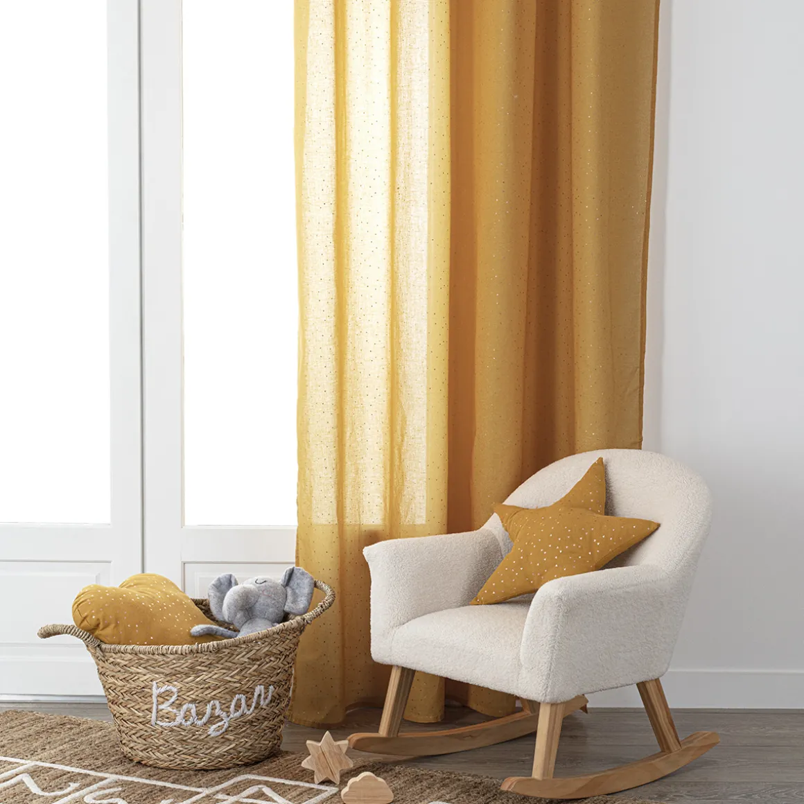 Accessoire élégant, ce voilage habille les fenêtres d’un voile de poésie. 100% coton, il permet de créer une ambiance feutrée et reposante dans les chambres des petits sans occulter complètement la lumière. Il doit son raffinement à de petits motifs dorés imprimés.