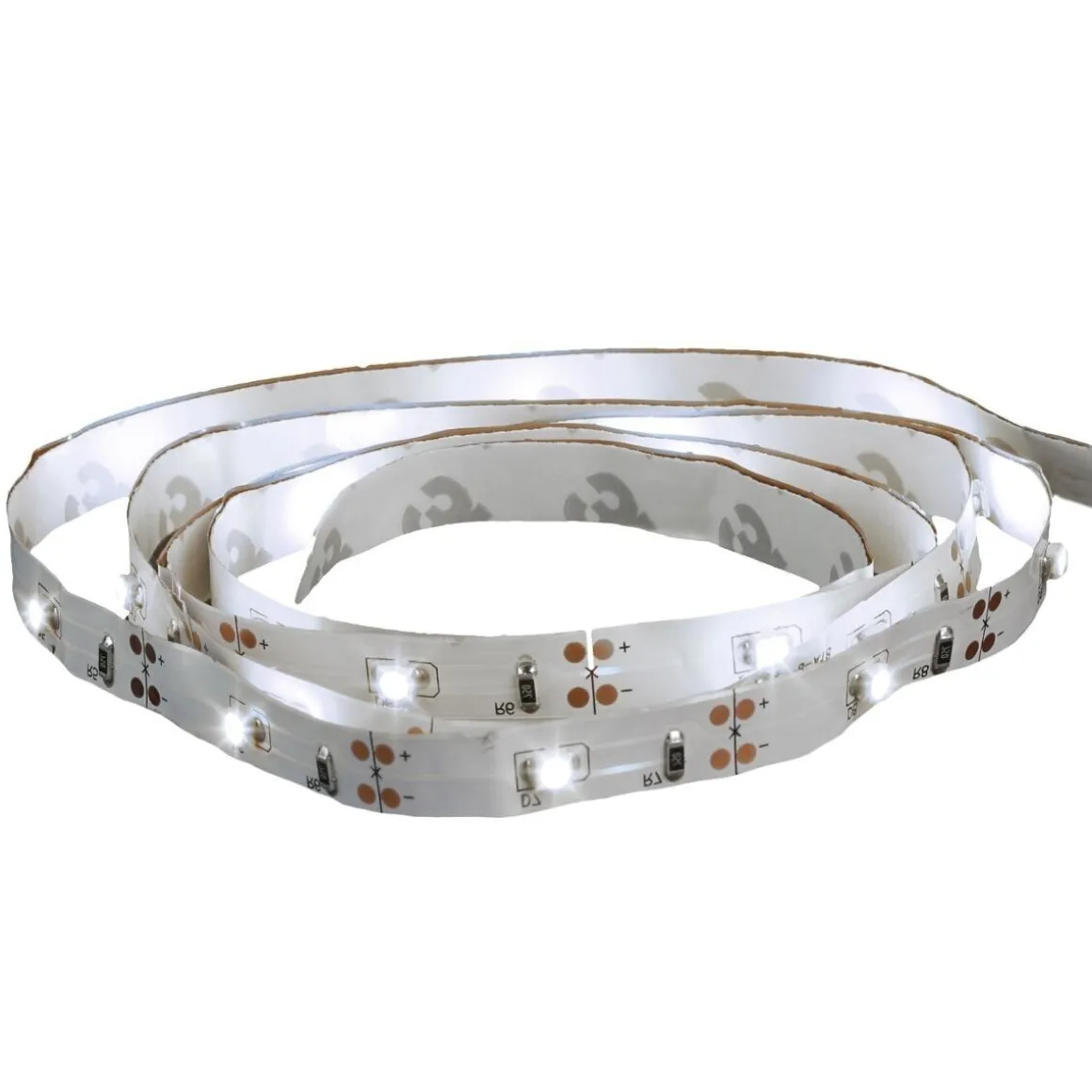 Ce ruban LED blanc peut se placer sur une rampe d’escalier, sur une étagère ou même derrière une TV murale.