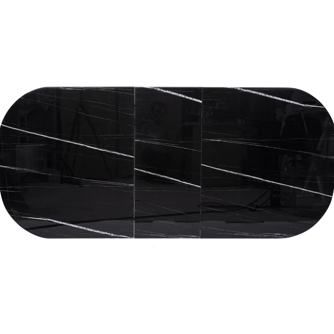 De type contemporain chic, la table de salle à manger « Mapu » associe des matériaux classiques tels que le verre et un piètement design en acier effilé. Le plateau ovale en verre trempé façon marbre s’éclaire de veinures contrastantes pour un fini plus doux.