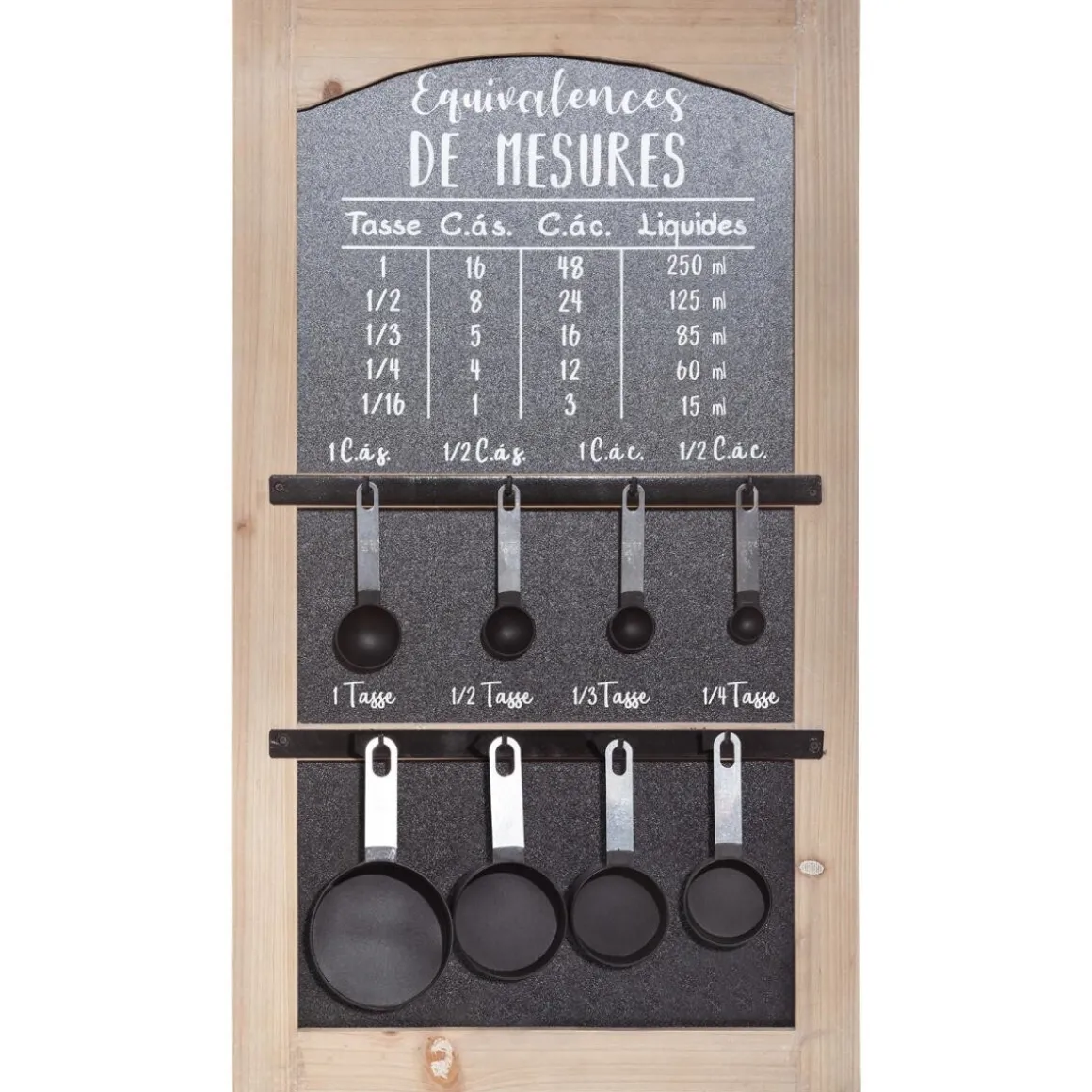 Ce tableau associe un cadre façon bois et un fond en acier imprimé d’un tableau d’équivalences transformant les tasses en cuillères à soupe et à café. Les montants à crochets accueillent 8 cuillères-mesurettes que vous pourrez utiliser en cuisine.