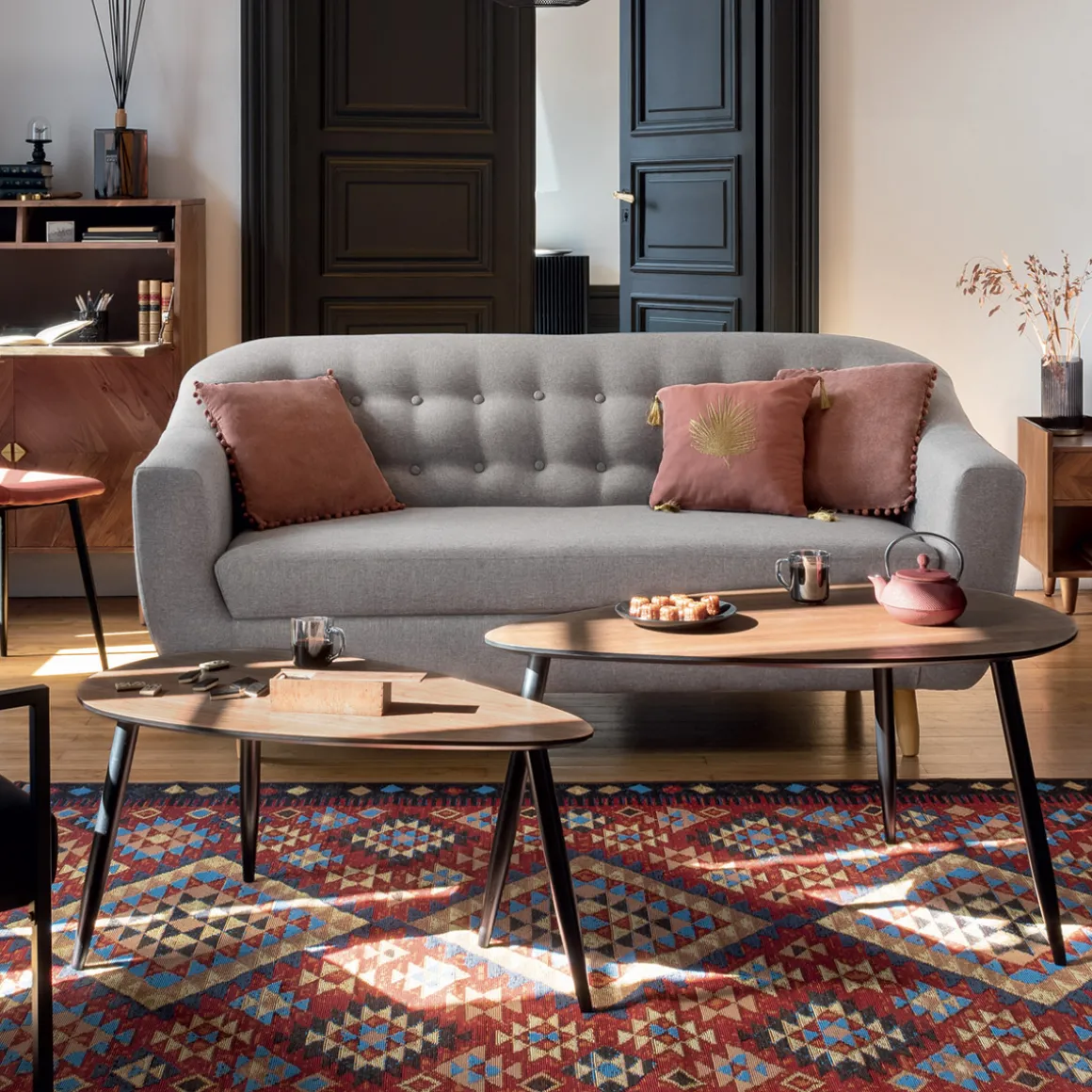 Pour composer un coin détente tendance et chaleureux, associez les tables à café « Mileo » à un tapis rond et un fauteuil de style scandinave Atmosphera.
