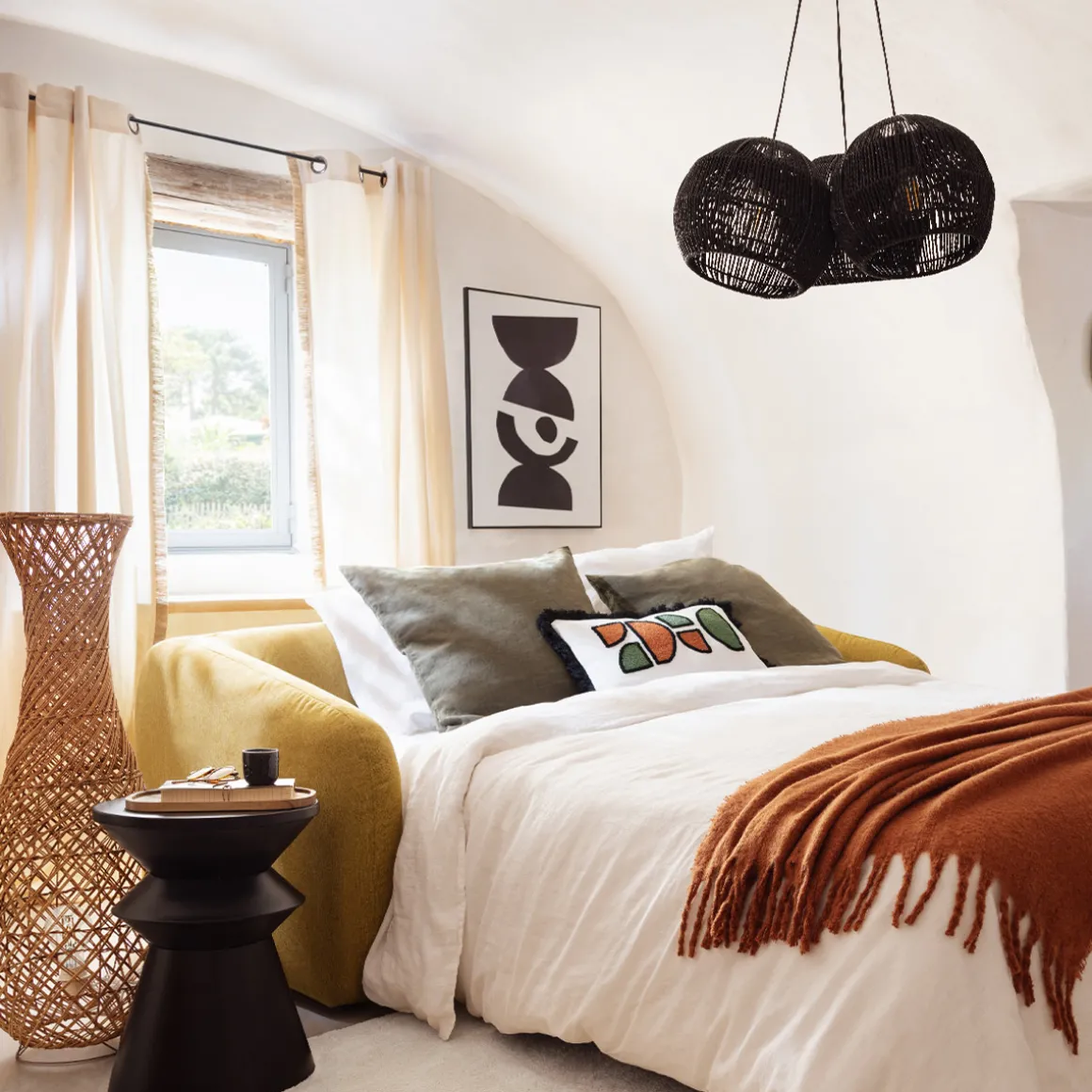 Ajoutez une suspension en rotin ou en bambou pour éclairer votre toile et placez un vase en céramique à ses côtés.