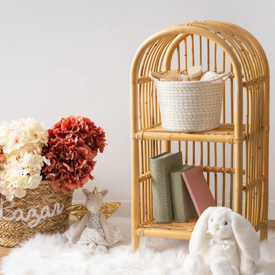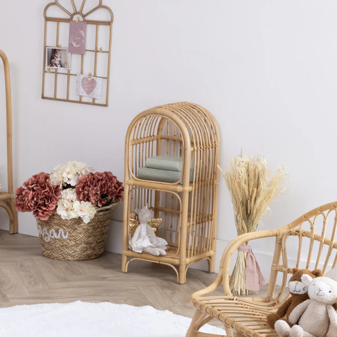 Créez un univers assorti avec une étagère murale et un fauteuil en rotin Atmosphera for kids.