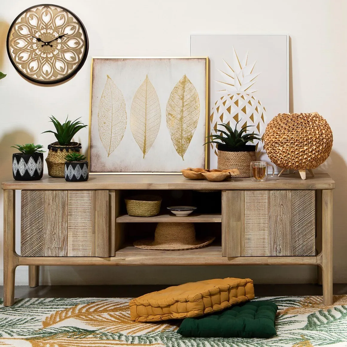 Agrémentez votre meuble TV de quelques objets artisanaux rapportés de vos voyages, tels qu’un pot en terre cuite ou une panière en paille.