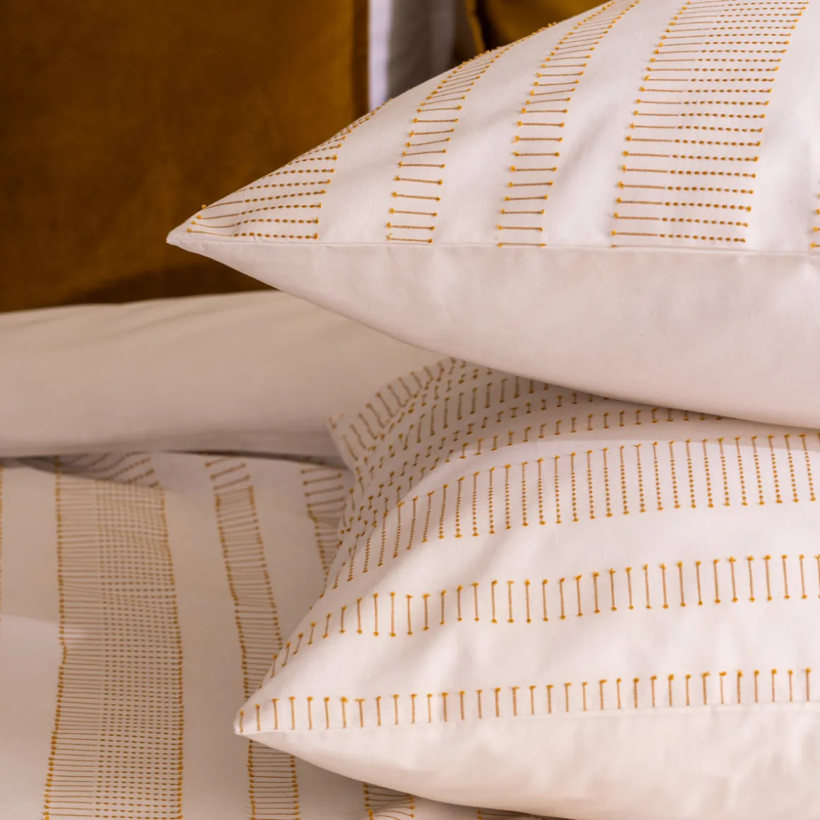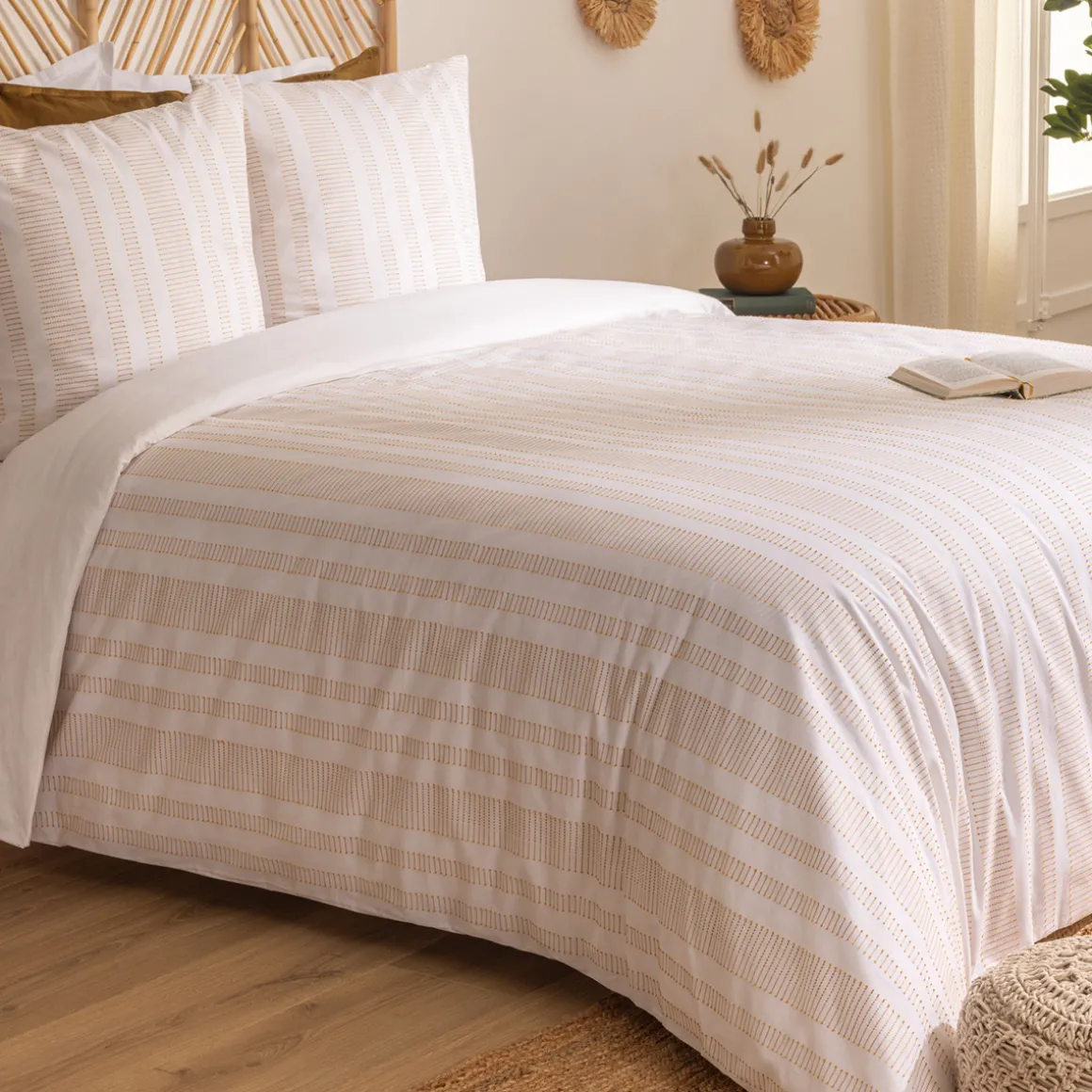 Les tons neutres de la parure de lit « Isao » créeront un joli relief avec des coussins colorés Atmosphera.