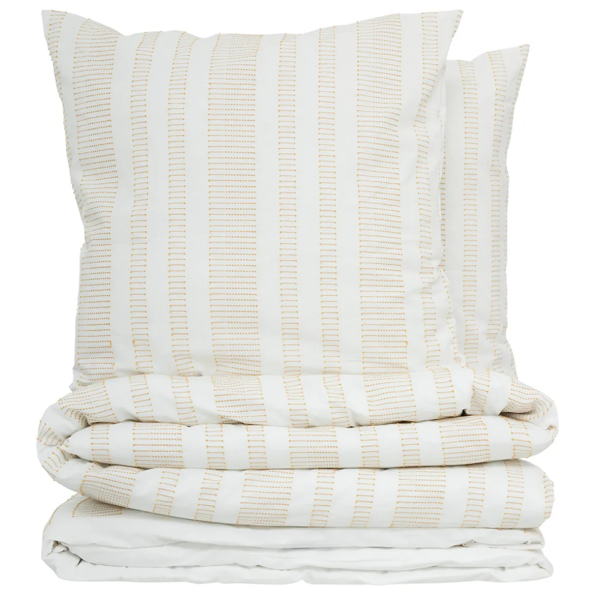 Conçu pour un lit deux personnes, cet ensemble comprend une housse de couette avec deux taies d’oreiller carrées. Les éléments sont confectionnés en coton pour vous permettre un nettoyage facile en machine.