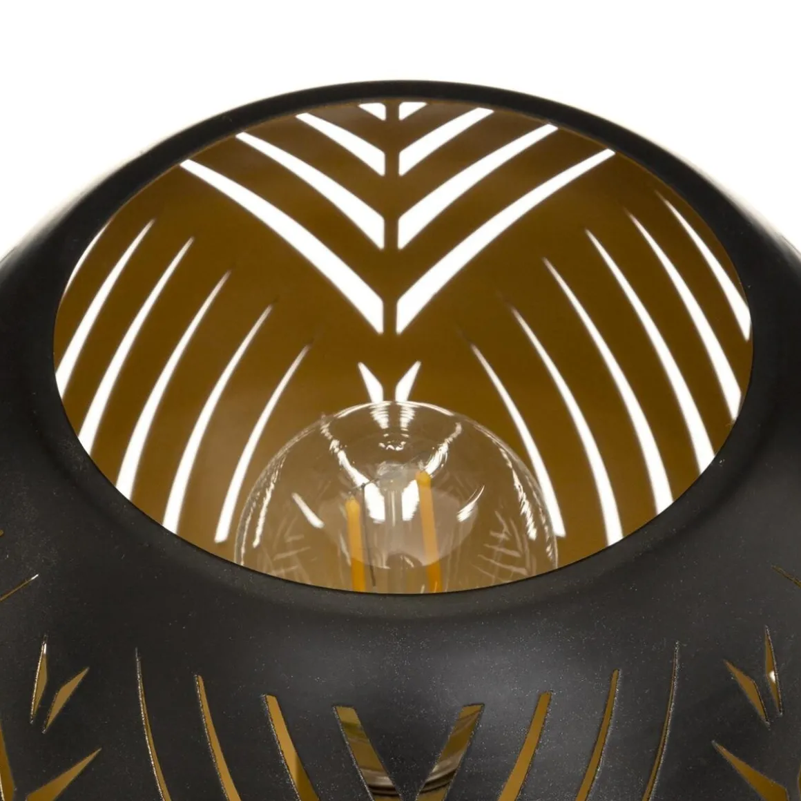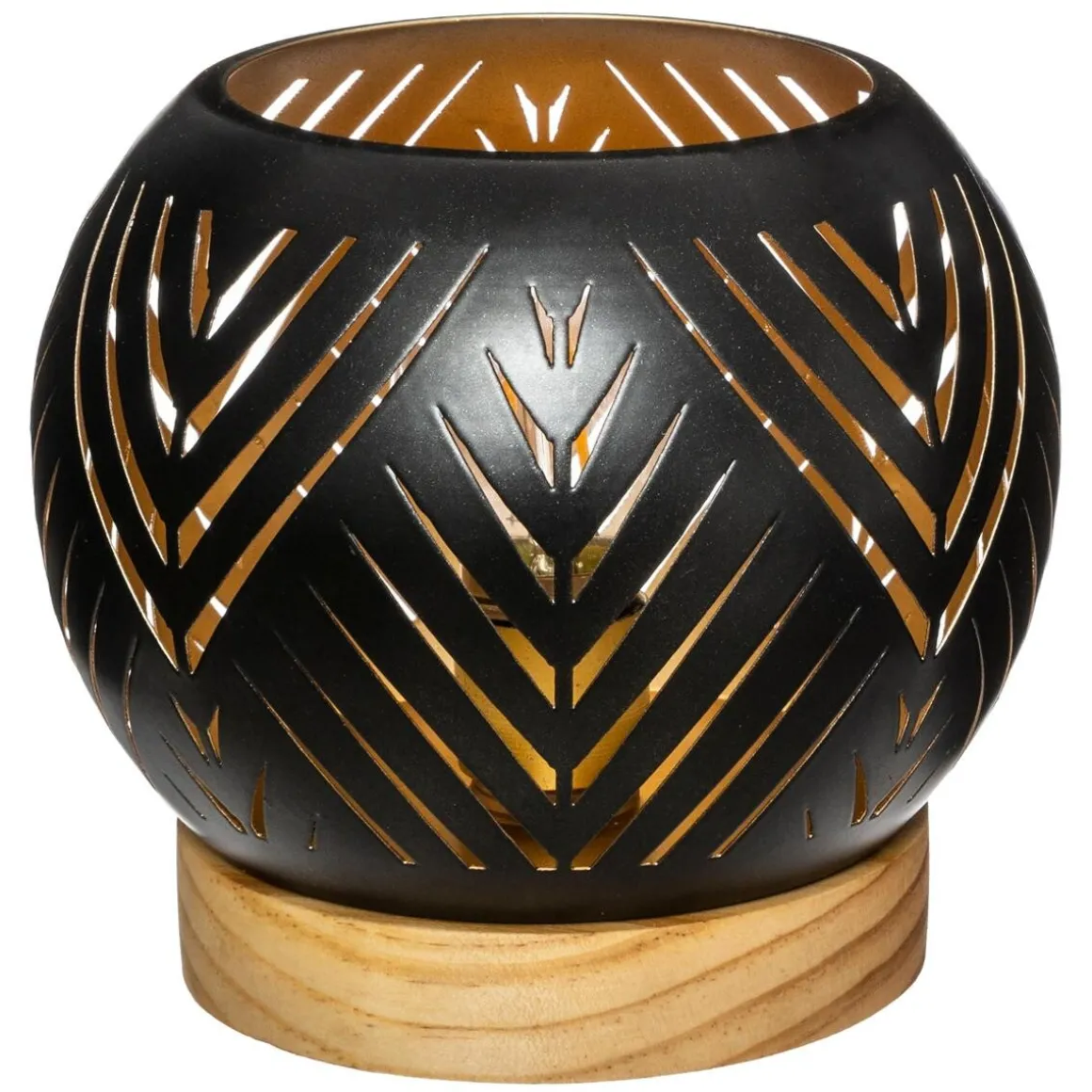 Ce photophore est composé d’une base en bois et d’une boule en métal. Celle-ci est ajourée de manière à laisser passer la lumière. L’ampoule LED intégrée fonctionne grâce à des piles. La teinte à l’intérieur de la boule apporte un côté chaleureux à l’éclairage.