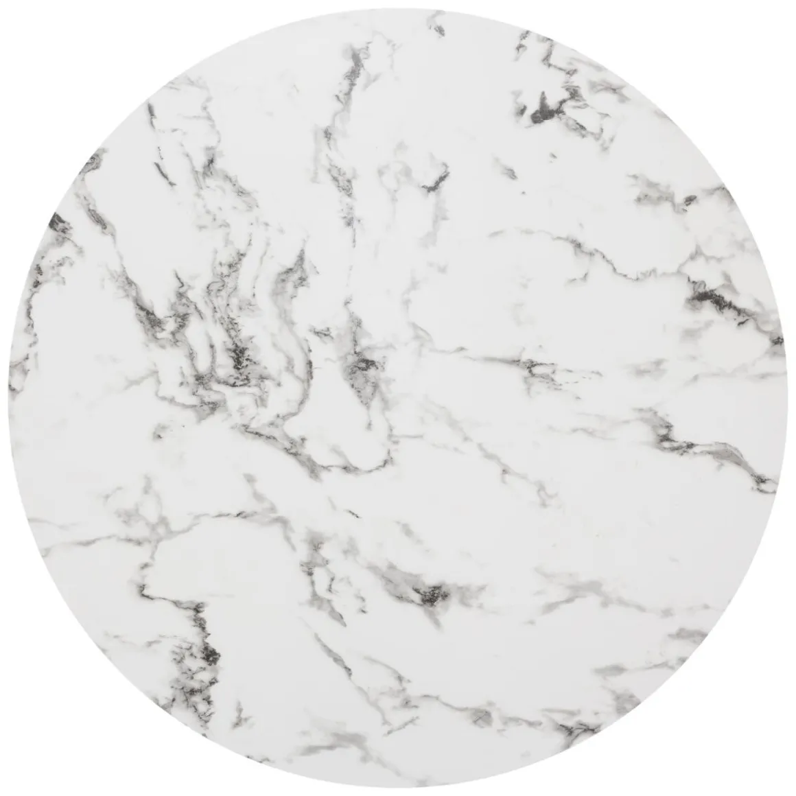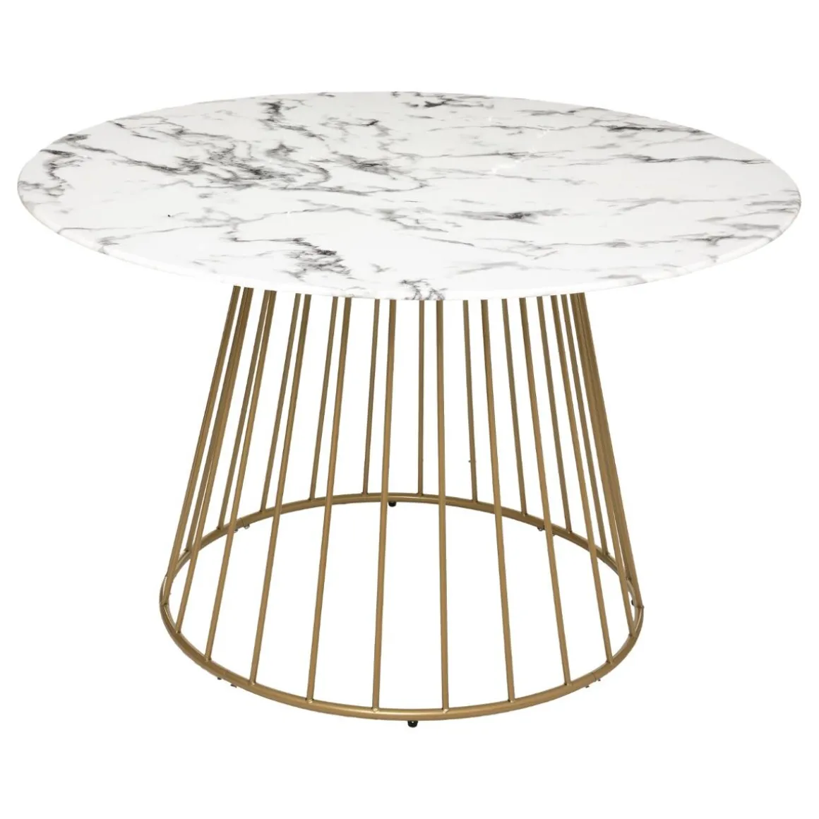 Composée d’une structure en fer légèrement conique qui soutient un plateau rond en verre trempé effet marbre, cette table apportera une touche chic et élégante à votre salle à manger.