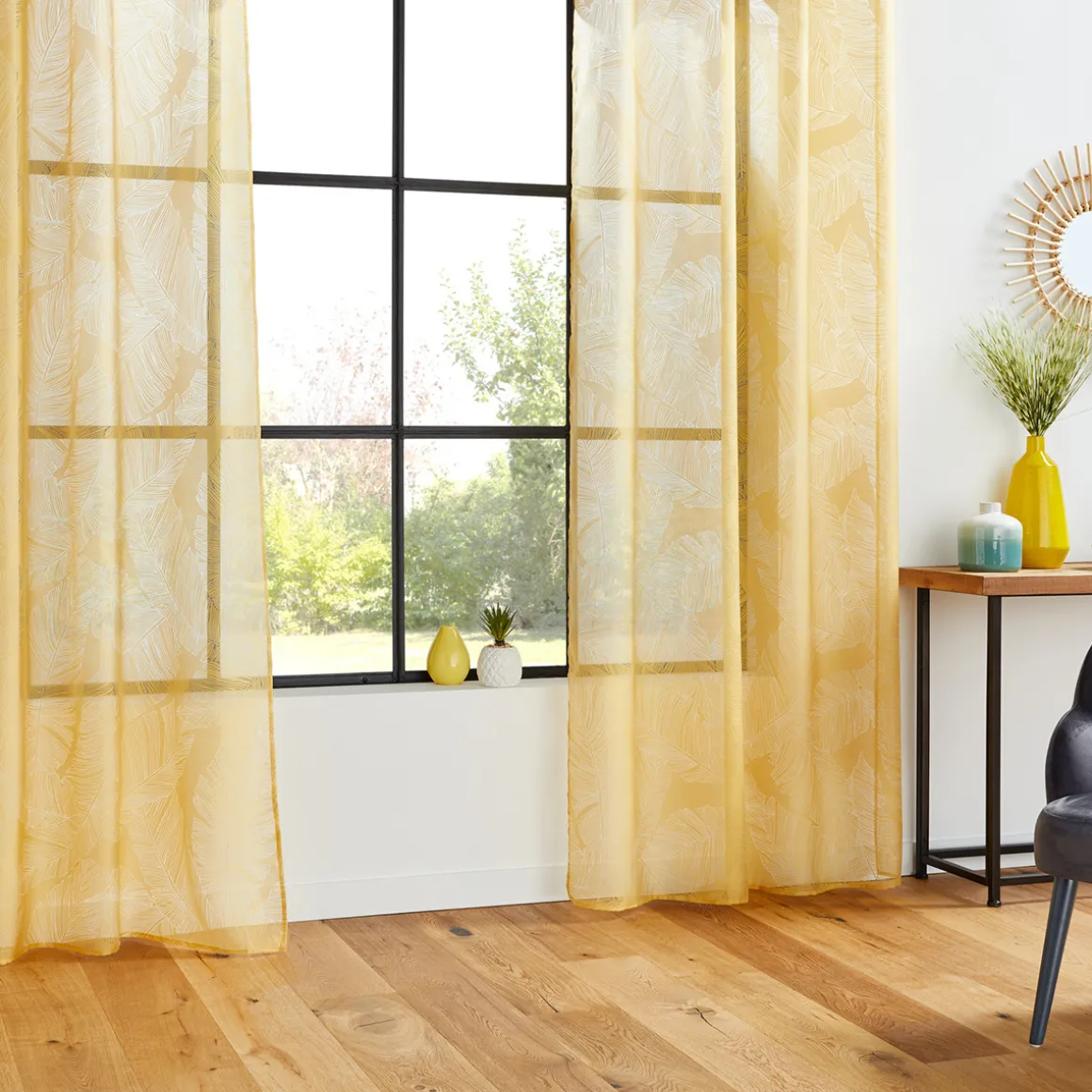 Le voilage « Devo » se caractérise par ses grands motifs en forme de feuilles qui décoreront à merveille une pièce à vivre. En plus de laisser passer la lumière, il vous protègera des regards extérieurs. Les oeillets en métal sont très pratiques pour l’installer rapidement sur une tringle à rideaux.